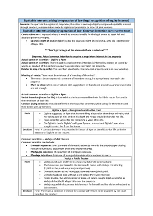 Notes for 5018 Notes cover the following topics: Indefeasibility. Exception to indefeasibility: Fraud. Exceptions to indefeasibility: Volunteers. Exceptions to indefeasibility: Paramount interest exemption. Co-ownership. Equitable interests arising by operation of law. Caveats. Equitable interests v Equitable interest priority dispute. ‘Mere equity’ v equitable interest priority disputes. Notes have been written in a checklist format.