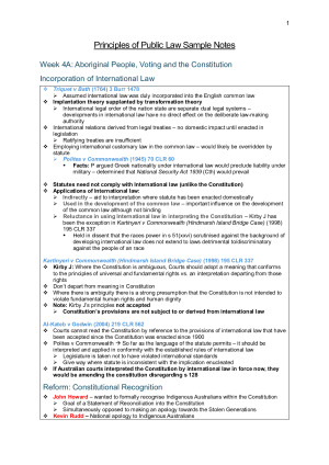 TOPICS COVERED: - Week 1A: Introduction - Week 1B: Constitutionalism and the Rule of Law - Week 2A: A Constitutional Hybrid 1 - Week 2B: A Constitutional Hybrid 2 - Week 3A: Path to Federation, Australian Federalism, Popular Sovereignty - Online Module: Acquisition of Legal Independence Readings - Online Module - Week 3B: Indigenous Sovereignty and Crown Sovereignty - Week 4A: Aboriginal People, Voting and the Constitution - Online Module: Uluru Statement from the Heart 56 - Week 4B: Legislature 1 - Week 5B: Legislature P2 - Online Module - Week 7A: Statutory Interpretation & Principles of Legality - Online Module - Week 7B: Executive P1 -Week 8A: Executive P2 - Week 8B: Judiciary P1 - Week 9A: The Judiciary Part 2 - Online Module: Boiler Makers Case - Week 9B: Rights Protection - Week 10A: Constitutional Change - Week 10B: Revision NOTE: These notes took over 50 hours to collate. Additional materials included are: - Class notes providing summarised content in accessible tables - All notes for online module readings and online module content