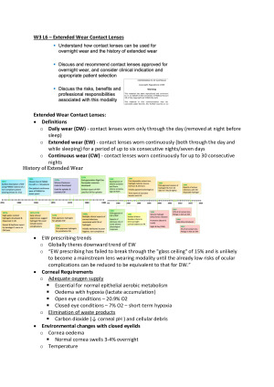 I easily got a H1 in this subject and with my notes you can too! My notes are easy to understand (with dot points and bolded sections that highlight important information). Covers all weeks (weeks 1-12) Topics covered: L1 – An Introduction to Advanced Contact Lenses L2 – Corneal Topography L3 – Presbyopic Contact Lens Correction L4+L5 – Spherical GP Lens (RGP/RCL) Fitting L6 – Extended Wear Contact Lenses L7 – Contact Lens Complications L8 – Toric GP Contact Lenses for regular astigmatism (RGP) L9 – Cylindrical Power Equivalent Toric Rigid Corneal Lenses (RCL/RGP) L10+L11 – Orthokeratology L12 – Contact Lens Solutions: Rigid Lens Maintenance & Solution Efficacy L13 + L14 – Keratoconus L15+L16 – Fitting the Irregular Cornea L17 – Contact Lens Fitting – Beyond the cornea L18 – Paediatric CL fitting L19 – The Contact Lens Aftercare – NOTE: CL aftercare part2 case studies is L23 L20 – Refractive Surgery L21+L22 – Management of Contact Lenses Post Refractive Surgery L23 – Contact Lens Aftercare - Case Studies (note: CL aftercare part1 is L19) L24 – Seeing the Future: with Contact Lenses
