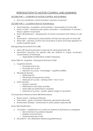 All lecture notes for the full EXPT2151 Motor Learning and Control course. Topics covered: Introduction to Motor Control and Learning Neuromotor Basis for Motor Control Sensory Components of Motor Control Memory and Attention Characteristics of Functional Skills Theories of Skill Acquisition Demonstration and Instruction for Motor Learning Feedback Delivery in Motor Learning Design of Effective Learning Environments Motor Learning in the Real World