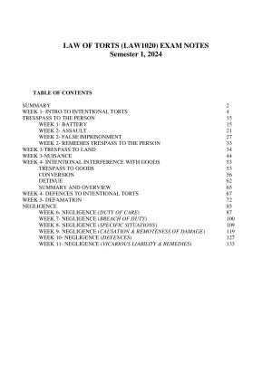 Law of Torts (1020) Exam and Course Notes created by a High Distinction student. The notes are comprehensive, thorough and cover all essential information, elements, and cases for each offence throughout the course. They are concise and structured for clarity, to provide guidance to help you understand and apply the legal concepts, including some written out paragraphs to aid you in the exam. I used them for my exam and received a HD in the course. Using these will save you a lot of time as my notes took me hours each week. Best of luck with the course—you’ve got this!