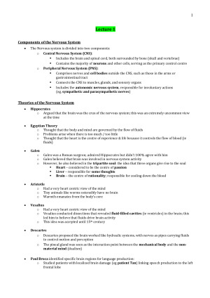 Top Scoring NEUR30003 Course Summary: Updated for 2025 Syllabus Smash NEUR30003 this semester with this comprehensive, top-scoring resource. For best results, convert the PDF into a Word document and annotate as you go! Lecture 1: Why have a nervous system? Lecture 2: The cellular basis of neural function Lecture 3: Neural communication Lecture 4: Glial cells Lecture 5: Development Lecture 6: Sex steroids and the nervous system Lecture 7: Measurement of structure and function Lecture 8: Chemical senses, Olfaction and Gustation Lecture 9: Tactile sensation and perception Lecture 10: Vision 1 Lecture 11: Vision 2 Lecture 12: Auditory sensation and perception Lecture 13: Autonomic nervous system 1 Lecture 14: Autonomic nervous system 2 Lecture 15: Neural control of digestion Lecture 16: Control of movement 1 Lecture 17: Control of movement 2 Lecture 18: Modulation of Movement Lecture 19: Pain Lecture 20: Fear Lecture 21: Reward Lecture 22: Meta-plasticity Lecture 23: Evolution of the nervous system 1 Lecture 24: Evolution of the nervous system 2 Lecture 25: Nervous system disorders 1 Lecture 26: Nervous system disorders 2 Lecture 27: Time place space Lecture 28: Language Lecture 29: Learning and memory - systems Lecture 30: Learning and memory - mechanisms Lecture 31: Social cognition Lecture 32: Other realms of cognition Lecture 33: Proof of our existence: consciousness