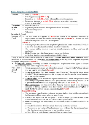 Topic 1 The Torrens system and indefeasibility Topic 3 Exceptions to indefeasibility Topic 4 Co-ownership Topic 5 Equitable interests arising by operation of law Topic 6 Protecting Registered and Unregistered interests in the Torrens system Topic 7 Priority disputes between unregistered interests in land These notes are comprehensive and detailed, offering in-depth explanations and strategies for answering exam questions effectively. They include a content page outlining key topics, with case names and legislation highlighted for easier reference and navigation. Important Notice: While these notes are designed to assist in your studies and exam preparation, direct copying and pasting of answers to exam questions may result in plagiarism. Use these notes as a guide to structure your answers, develop your arguments, and apply your understanding of the material in your own words. Exam notes - 22 pages