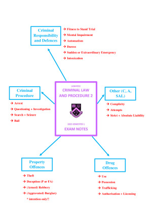 LAW4332 HD Exam Notes - Criminal Law and Procedure 2 Achieve academic success with these comprehensive and high-quality LAW4332 exam notes for Criminal Law and Procedure 2 prepared in 2023 Semester 1. Designed for high-achieving law students, these notes feature: PART 1: PROPERTY OFFENCES ** [A] Theft ** [B] Obtaining Property by Deception ** [C] Obtaining Financial Advantage by Deception ** [D] (Armed) Robbery ** [E] (Aggravated) Robbery PART 2: DRUG OFFENCES ** [F] Using a DOD ** [G] Possessing a DOD ** [H] Trafficking a DOD ** [I] Authorisation and Licensing PART 3: CRIMINAL RESPONSIBILITY AND DEFENCES ** [J] Fitness to Stand Trial ** [K] Mental Impairment (NGMI) ** [L] Automatism (Involuntary Acts) ** [M] Duress (Pressured or Threatened to Act) ** [N] Sudden or Extraordinary Emergency (Necessity) ** [O] Intoxication (Drugs and/or alcohol) PART 4: OTHER: COMPLICITY, ATTEMPTS, S+A LIABILITY ** [P] Complicity ** [Q] Attempts ** [R] Strict and Absolute Liability PART 5: CRIMINAL PROCEDURE ** [S] Arrest ** [T] Questioning and Investigation ** [U] Search and Seizure ** [V] Bail Perfect for students seeking structured, colour-coded, easy-to-follow notes to boost their grades. Download now and prepare with confidence!