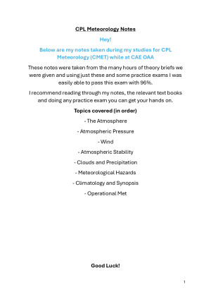 Hey! Below are my notes taken during my studies for CPL Meteorology (CMET) while at CAE OAA These notes were taken from the many hours of theory briefs we were given and using just these and some practice exams I was easily able to pass this exam with 96%. I recommend reading through my notes, the relevant text books and doing any practice exam you can get your hands on. There are 32 pages of size 11 font! Everything you need for the exam is in there