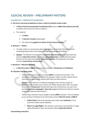 Simple fill-in-the-blank guide for the Administrative Law Unit Exam. Includes references to possible cases for each topic. Guide on the following topics: 1) Preliminary Judicial Review Matters - Jurisdiction (statute & constitution) - Jurisdiction (ADJR Act) - Justiciability - Standing 2) Grounds of Review - Jurisdictional Fact - Unlawful Delegation - Procedural Error - Misconceiving the Scope of Power - No Evidence Ground - Irrelevant and Relevant Considerations - Improper Purpose - Acting Under Influence (Dictation) - Inflexible Application of Policy - Fraud - Bad Faith - Unreasonableness - Procedural Fairness 3) Jurisdictional Erorr 4) Remedies 5) Private Clauses 6) Merits Review 7) Access to Documents