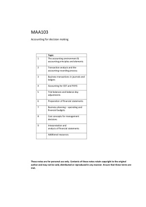 Comprehensive Accounting for Decision Making notes. Includes key theory, illustrations, and worked examples similar to what is likely to present in assessments. Everything needed to enable you to achieve a perfect grade. Good luck! Topics: Topic 1. The accounting environment & accounting principles and elements Topic 2. Transaction analysis and the accounting recording process Topic 3. Business transactions in journals and ledgers Topic 4. Accounting for GST and PAYG Topic 5. Trial balances and balance day adjustments Topic 6. Preparation of financial statements Topic 7. Business planning – operating and financial budgets Topic 8. Cost concepts for management decisions Topic 9. Interpretation and analysis of financial statements