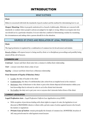 Elevate your legal studies with these crafted Commercial Practice and Ethics notes, designed specifically for university students and exam takers. This comprehensive resource breaks down the core elements of commercial practice and ethics into clear, digestible sections, helping you master everything from the fundamentals of professional duties to intricate topics like commercial contract drafting and retail leases. Key Features Include: Structured Organization: Follow a logical layout that mirrors your course syllabus, making locating and reviewing essential topics easy. Up-to-date Content: Stay current with the latest legal standards and professional practices in the field. Exam-Focused Approach: Benefit from concise explanations and integrated skeleton answers designed to streamline your revision process. User-Friendly Navigation: A clearly outlined table of contents allows for quick reference, ensuring efficient study sessions. Table of Contents Overview: INTRODUCTION DUTY OF CONFIDENTIALITY TO THE CLIENT DUTY OF LOYALTY TO THE CLIENT DUTY OF COMPETENCE DUTY OF TRUTH AND HONESTY UNSATISFACTORY PROFESSIONAL CONDUCT AND PROFESSIONAL MISCONDUCT UNDER STATUTE SOLICITORS CPD RULES WILLS AND ESTATES SALE OF BUSINESS COMMERCIAL CONTRACT DRAFTING GUARANTEES AND INDEMNITIES RETAIL LEASES Whether preparing for exams or seeking a deeper understanding of commercial ethics and practice, these notes offer an all-inclusive guide to help you excel. Empower your study sessions with a resource that simplifies complex legal concepts and builds confidence for every assessment.