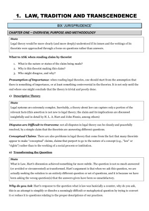 Delve into the profound world of legal philosophy with these meticulously curated study notes explicitly crafted for university students and exam takers. This comprehensive resource explores the foundational theories and debates that shape our understanding of law, from traditional paradigms to contemporary critical perspectives. Each topic is presented with clear, concise explanations that are both thought-provoking and exam-ready, making it the perfect companion for anyone looking to deepen their knowledge and analytical skills in legal philosophy. Key Features Include: Structured Organization: Topics are arranged logically to mirror your course syllabus, ensuring seamless navigation through complex theories. Comprehensive Coverage: Explore a wide range of philosophical perspectives, from legal positivism and natural law to critical theories and identity politics. Exam-Focused Insights: Benefit from clear explanations and structured summaries that make revision efficient and effective. Up-to-date Analysis: Stay current with modern legal philosophy interpretations and debates that reflect historical context and contemporary thought. Table of Contents Overview: LAW, TRADITION AND TRANSCENDENCE OBLIGATION TO OBEY LAW LEGAL POSITIVISM AND NATURAL LAW JUSTICE AND CONTRACTUALISM (SOCIAL CONTRACT THEORY) LEGAL REALISM (AMERICAN AND SCANDINAVIAN) AND THE ANTI-METAPHYSICAL TURN; PRAGMATISM FRAMEWORKS OF LAW AND CULTURE (Note: Chapter 7 intentionally omitted or integrated with subsequent topics) LAW, JUSTICE AND PUNISHMENT CRITICAL AND LEGAL THEORIES, POWER AND IDENTITY POLITICS RIGHTS AND UNIVERSALITY/ RIGHTS AND THE SOCIAL TEACHINGS OF THE CHURCH LAW AND LIFE (LITERATURE AND THE SPIRIT OF LAW UNDER RESTRAINT) Empower your academic journey with these insightful notes that simplify complex ideas and sharpen your critical thinking. Whether preparing for exams or seeking a deeper understanding of legal philosophy, this resource is your essential guide to success.