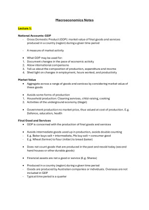 Achieved 100% in all assignments and 98 overall for the subject using these notes. Contains all lecture and tutorial material with my own sample responses sprinkled throughout the notes. Notes include the following topics: 1. Introduction & Measuring Output: GDP 2. Inflation and interest rates & Saving, wealth and investment 3. The Labour Market & Short-term Economic fluctuations 4. Keynesian Model of the Economy 5. Keynesian Model of the Economy & Fiscal Policy 6. Monetary Policy, inflation and Financial Markets 7. Aggregate Demand and Supply Model 8. Introduction to Growth & Solow-Swan Model 9. Solow-Swan Model 10. International Trade 11. Exchange Rates 12. Balance of Payments
