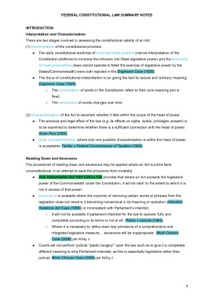 Final exam scaffold covering: - Interpretation and characterisation - Reading down and severance - Race power - Taxation power - Grants power - Defence power - Freedom of interstate trade and intercourse - Freedom of political communication - Intergovernmental immunities