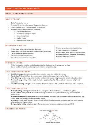 Notes include: 1. Value-based pricing 2. Strategy and pricing 3. Traditional approaches to pricing 4. Price sensitivity and margin arithmetic 5. Pricing and behavioural economics 6. Conjoint analysis 7. Survey-based approach & conjoint analysis 8. Conjoint analysis cont 9. Price segmentation and communication 10. Pricing in digital economy and service pricing