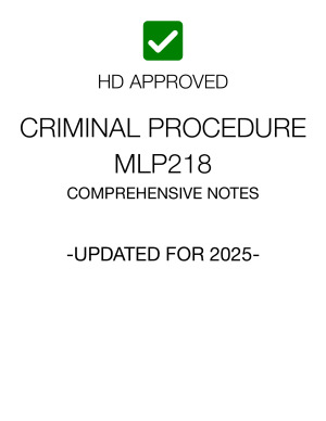 These are the notes I wrote myself and used in the exam to receive an 86 HD overall for MLP218 Criminal Procedure. This was a great exam for me, and these notes really helped me pull out the right law quickly and produce HD-level analysis. I hope these notes help you get the grades you desire. These notes cover the following topics: - Search of a Person and their Possessions - Forensic Procedure > Non-Voluntary Forensic Procedure > DNA Samples > Fingerprinting - Police Questioning > Silence and Privilege Against Self-Incrimination > Questioning in Police Custody > Admissions - Identification Evidence > Visual Identification Evidence > Picture Identification Evidence - Commencement of Criminal Proceedings > Arrest > Commencing Trial - Committal Procedure for Indictable Offenses - Jury Selection