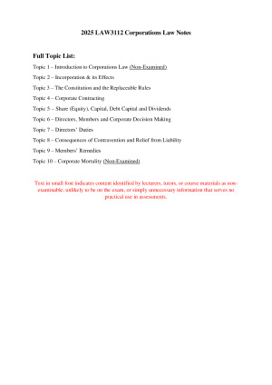 These comprehensive Corporations Law notes (which are HD proven on assessments) cover all topics assessed in the mid-semester assessments (Online Quiz and Written Assignment) AND the exam. With just under 200 pages (197), they are meticulously detailed and have been curated by synthesizing a wide array of authoritative resources, including the course textbook, class PowerPoint presentations, LSS Sketch Notes, Seminar Slides, and most importantly the author's own personal notes from attending lectures and tutorials. BUYER BEWARE: It is a mistake to believe less detailed notes with less pages is sufficient for this unit. Corporations Law has an enormous amount of examinable content and requires detailed notes. I would not have devoted such extensive effort if a lesser approach had been sufficient. The notes not only cover all examinable content but also assist with the structure and answering of questions. They provide detailed steps for addressing different legal issues, along with checklists and pre-formulated case analogies for quick application in scenarios where exam facts correspond with case law. These notes are designed to be the ultimate one-stop resource for Corporations Law, a tool I deeply wished for during my own studies of this unit. Now, you have the opportunity to benefit from hundreds of hours of my meticulous work, all available for a small fee. Topics Included: Topic 1 – Introduction to Corporations Law Topic 2 – Incorporation & its Effects Topic 3 – The Constitution and the Replaceable Rules Topic 4 – Corporate Contracting Topic 5 – Share (Equity), Capital, Debt Capital and Dividends Topic 6 – Directors, Members and Corporate Decision Making Topic 7 – Directors’ Duties Topic 8 – Consequences of Contravention and Relief from Liability Topic 9 – Members’ Remedies Topic 10 – Corporate Mortality