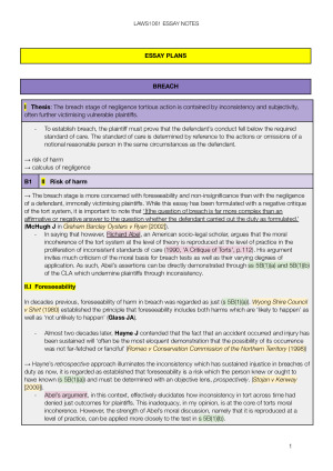Breach Causation Defences Damages Balancing the interests of plaintiffs and defendants Women and tort Vicarious Liability Article Summaries: Richard Abel, 'A Critique of Torts' (1990) Jeremy Waldron, 'Moments of Carelessness and Massive Loss' (1997) Mark Lunney, Personal Responsibility and the ''new'' volenti (2005) Reg Graycar, 'Damaging Stereotypes' (2012) Bismark and Paterson, 'No-Fault Compensation in New Zealand' (2006)