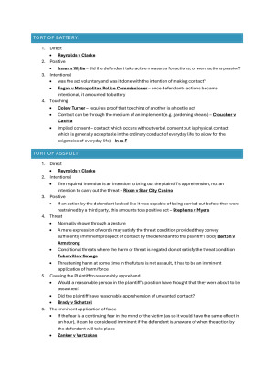Elements of a tort Types of Torts Tort of Battery Tort of Assault Tort of False Imprisonment Defences (battery, assault, false imprisonment) Trespass to Land Defences (trespass to land) Remedies Private Nuisance Defences (Nuisance) Remedies (Nuisance)