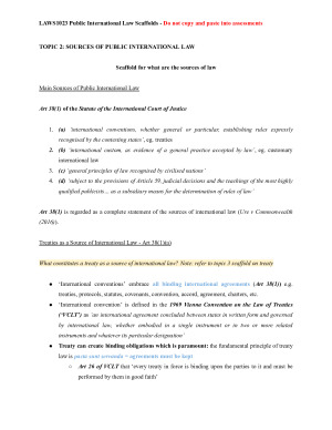 BENEFITS OF MY SCAFFOLDS - These scaffolds provide you with order, step-by-step and structure in how you approach problem questions, you are going to love these scaffolds (see preview of my scaffolds) - SO COMPREHENSIVE - WILL BE USEFUL FOR ESSAY - Has paragraph pinpoints to the judgments and cases - this will be so helpful if you want High Distinction - It clearly sets out and IRAC yet with enough comprehensive analysis to score higher - I have provided the name of the cases of each legal tests, rules, precedents - Hundreds of hours were spent on crafting this scaffold - helps with the TIME CONSTRAINTS during the exams - These scaffolds have been tested by a few other law students and all found it SUPER HELPFUL - The lines are spaced out to allow more room for your own editing and also visually more pleasing - Just have a look at the PREVIEW scaffold!! HOW TO USE THESE SCAFFOLDS? - Review the relevant topic scaffold to have a general yet comprehensive understanding of the topic before lecture - Public International Law is a very content-heavy subject so these scaffolds are meant to be concise yet comprehensive - Use these scaffolds to answer tutorial questions, mid-semester assignment (problem question) - Make sure to familiarise yourself with the scaffold before exam MY GUARANTEE - This is going to so comprehensive and especially if you are BEHIND the topics. These concise scaffolds provide a comprehensive overarching step-by-step approaches to all problem questions. TOPICS - Sources of Public International Law - The Law of Treaties - International Law and Municipal Law - Personality, Statehood, Self-Determination - Title to Territory - State Jurisdiction - Immunity from Jurisdiction I - Immunity from Jurisdiction II - State Responsibility I - State Responsibility II - Use of Force