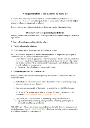 High distinction litigation final exam notes/scaffold. Topics include: PRE-COMMENCEMENT WHAT JURISDICTION IS THE MATTER TO BE HEARD IN? PARTIES: LIMITATION PERIOD PRELIMINARY DISCOVERY ORIGINATING PROCESSES URGENT RELIEF Interlocutory injunction: Inspection, detention, custody and preservation of property: Freezing order (‘Mareva orders’): Search order (‘Anton Pillar order’): PLEADINGS: General pleadings: Statement of Claim: Particulars: Reply to defence: Can the pleadings be struck out: Can X depart from their pleadings DEFENDING PROCEEDINGS [DEFENDANT]: Has a NOITR or defence been filed? Defence: Are there information gaps or defects [ie. further and better particulars/ striking out]? Can D bring forward a counter claim/third-party claim? SERVICE: Personal service Ordinary service Is substituted service possible? MISTAKE OR AMENDMENT: Can a party amend originating processes? Can a party amend their pleadings? ENDING PROCEEDINGS EARLY: Can a party seek a discontinuance? Can a party seek a consent judgement? Is a party entitled to a default judgement? Can a party apply for a summary judgement? SETTLEMENT CALDERBANK OFFER: OFFER OF COMPROMISE: JUDGEMENT APPEAL APPEAL OF AN INTERLOCUTORY ORDER APPEAL OF A FINAL JUDGEMENT