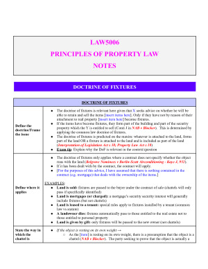 Easy to follow and detailed property law exam notes Includes writing prompts, cases + application, statute + application (Received 87% on assignment about easements using this template and received no constructive feedback on application or legal principles used). TOPICS COVERED: Fixtures + Removal Finders Keepers Doctrine of Estates Doctrine of Waste Transfer of goods/gifts Creation of Leases Leasehold Estates Types of Leases Contractual licenses Leasehold Covenants Assignment of leases Transfer of Land Adverse Possession Easements Restrictive Covenants Mortgages