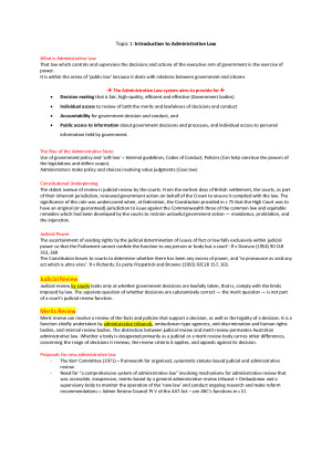 Administrative Law notes - exam completed in March 2025. Received a credit for the exam. - Topics included; Topic 1; Intro into Admin Law Topic 2; Rule making and Subordinate legislation Topic 3; Refugee Issues Topic 4; Procedural Fairness Topic 5; Merits Review Topic 6; Judicial Review Topic 7; Standing and Privative Clauses Topic 8; Reasons for Decision Topic 9; Freedom of Information (FOI) & Ombudsman and Privacy Topic 10; Ethical Issues in Administrative Law Topic 11; Public Inquiry Issues Topic 12; Anti-Terrorism Issues