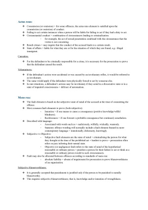 Description: Detailed and comprehensive Criminal Law notes created by a second-year law student. This 144-page set covers every topic across all weeks, including readings, case law, and thorough notes. The notes ease you into the unit with clear explanations of key legal principles, cases, and statutes—perfect for helping you understand the material thoroughly and stay exam-ready. Designed to ensure you don’t miss a thing! Includes: Full explanations of actus reus, mens rea, defences, sexual offences, homicide, sentencing, and more Key case summaries Relevant sections of Victorian legislation Clear structure following the course content week by week A great balance between detail and clarity Topic List: INTRODUCTION TO CRIMINAL LAW 4–6: Foundations of criminal law 7: R v Brown 8–9: Why punish crimes? 10: Legal framework of criminal law 11: Different kinds of criminal offences 12: Who cannot commit crimes? 13: Criminal procedure 14: ss27–30 Criminal Procedure Act 2009 + ss113–113B Sentencing Act 1991 15: Individual rights and public interest + burden of proof + role of discretion 16: Charter of Human Rights and Responsibilities Act 2006 SENTENCING 17: Powers and processes 18–19: Division 3 Criminal Procedure Act 2009 20: Sentencing hearing 21: Victorian sentencing manual 22: George Hampel – Plea in Mitigation 23: Sentencing framework + Sentencing Act 1991 (Vic) 24: Sentencing options + non-custodial/custodial options 25–26: Sentencing Act 1991 ELEMENTS OF A CRIME 27: Basic principles of criminal responsibility 28: Actus reus + mens rea 29: Ugle v R, R v Hallett, R v Blaue 30: Concurrence and proving crimes + Thabo Meli v R, Fagan v Metropolitan Police Commissioner 31: Proving crimes + Section 6 Jury Directions Act 2015 NON-FATAL OFFENCES AGAINST THE PERSON 32–33: Common assault + Brady v Schatzel 34: Ryan v Kuhl, Fagan v Metropolitan Police Commissioner, R v Venna, Rosza v Samuels, Tuberville v Savage, Sanker v Vartzokas 35: R v Ireland, Collins v Wilcock + questions 36: Questions 37–38: Offences involving injury and serious injury 39: Questions 40: R v Westaway 41: R v Campbell, DPP Reference No 1 of 2019 42: Other CA offences (threat/endangerment) 43: CA threats and conduct offences 44: R v Abdul-Rasool 45: Lawful excuses – the role of consent 46: R v Patton, R v Venna, R v Coleman, R v Campbell 47: Ritual circumcision + sexual diseases 48: Surgery and body modifications + R v Stein 49: R v Wilson, R v Emmett, Pallante v Stadiums SEXUAL OFFENCES 50–51: Introduction to sexual assault + CA s 37A/37B 52: Rape – actus reus 53–54: CA s 35A + questions 55: Rape by compelling sexual penetration + CA s 39 56: Consent and its absence + CA 1958 s 36 57: Consent negating circumstances + CA s 36AA 58: Communicative model of consent 59: Dual conception of consent 60: Mistake, deception and consent + Papadimitropoulos v R 61: Conditional consent and its legal implications + CA s 38 62: Jury Directions Act 2015 s 46, 47C, 47D, 47E 63: 47F, 47G, 47H 64–65: Rape – mens rea 66: DPP v Morgan 67–68: Lazarus v R 69: Jury Directions Act s 47, 47C 70: R v Kitchener, Banditt v R 71: Bakshi v Queen 72: CA s 36A 73: Intoxication and reasonableness + CA s 36B 74: Other sexual offences + CA s 35B 75–76: CA s 40, 41, 43 HOMICIDE – MURDER 77: Unlawful homicides 78: CA s 3, 5, 5A, 5B 79: Infanticide 80: CA s 6 81–82: Suicide + CA s 6A, 6B 83: Euthanasia 84: Culpable driving causing death + CA s 318 85: Dangerous driving causing death or serious injury + CA s 319 86–90: Murder – actus reus + introduction to murder 91: R v Ryan and Walker 92: Ugle v R, R v Hallett 93: Royall v R, R v Pagett, R v Blaue 94: R v Jordan, R v Smith, R v Evans and Gardiner 95: R v Malcherek, R v Swan 96–98: Murder – mens rea + R v Crabbe 99–100: Constructive murder + CA s 3A 101–102: R v Ryan and Walker 103: R v Galas HOMICIDE – MANSLAUGHTER 104–107: Overview 108–111: Manslaughter by unlawful and dangerous act + Wilson v The Queen 112: R v Lamb 113: Pemble v R 114: R v Stein + CA 4A 115–117: Manslaughter by criminally negligent act + Nydam v R 118–119: R v Lavender 120: Manslaughter by criminally negligent omission 121–122: R v Instan 123–124: R v Stone and Dobinson 125: R v Taktak DEFENCES 126–130: Contesting a charge + CA s 322K, 322O, 322R, 322T 131–133: Self-defence + Zecevic v DPP + CA Part IC 134: Self-defence and family violence + Osland v R + CA s 322J 135: Section 322J of CA 136: Jury Directions Act 2015 s 58, 59 137: Jury Directions Act s 60 138–140: Intoxication, duress, and emergency + Part IC of CA + 322J + R v Connor + CA 1958 s 322O 141: CA s 322O 142: CA s 322P + R v Dudley 143: Division 4 sudden or extraordinary emergency CA