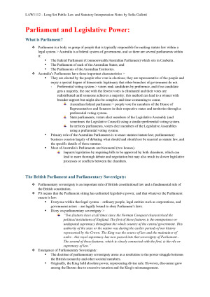 These LAW1112 – Public Law and Statutory Interpretation notes offer a complete, in-depth guide across all content in the unit. With 81 pages and over 38,500 words, they consolidate textbook readings, key cases, videos, constitutional provisions, legislation, and workshop materials into one clear and structured document. Perfect for mastering complex concepts, preparing for exams, or reinforcing lecture material throughout the semester. Perfect for: Open-book exams Weekly revision Workshop prep and active class participation Breaking down dense legal readings Includes: Coverage of every topic in the LAW1112 curriculum Detailed summaries of cases, statutes, constitutional sections, and legal theory Clear structure and headings for fast navigation during assessments Workshop-ready content for statutory interpretation practice Excellent support for understanding both public law principles and legislative analysis Topic List: PART ONE: PUBLIC LAW 1. Introduction and Foundational Concepts What is Public Law? Public vs Private Law Rule of Law Constitutionalism Obeying Unjust Laws (case study + MLK reading) 2. Relationships and Structures Democracy & Government Federalism Separation of Powers Responsible Government International Legal Obligations Constitutional Relationship with Indigenous Australians 3. Origins and Evolution of Australian Public Law Terra Nullius and Constitutional Reform Uluru Statement, Referendum Council, and Voice Proposal 4. Parliament and Legislative Power What is Parliament? Parliamentary Sovereignty (UK and Australia) Legislative and Non-Legislative Powers Law-making Processes Extreme Laws (case study) 5. The Executive Role and Institutions of the Executive Sources of Executive Power Oversight and Accountability Case Studies 6. The Courts and Judicial Power Judicial Independence Separation of Judicial Power Role of Courts and Chapter III Nuremberg Trial Case Study 7. Public Law in Practice: Human Rights Protection of Human Rights in Australia ACT and VIC Charters Federal Rights Scrutiny Reform Proposals PART TWO: STATUTORY INTERPRETATION 8. Our Statutory Universe What is a Statute? Role of Parliament and Legislative Intent How Interpretation Works 9. Text, Context and Purpose Textual Analysis Purpose-Based Interpretation Contextual Reading Latin Maxims and Drafting Conventions 10. Presumptions and Protecting Rights Presumption Against Retrospectivity Mens Rea Principle of Legality Interaction with Human Rights Instruments 11. Statutory Interpretation Workshops Application of Interpretation Principles Real Problem-Based Exercises Structured Pre/In/Post Lecture Activities Guided Practice with Problem Questions