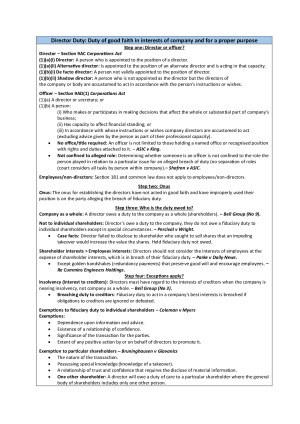 Each topic is in checklist format. Topics: Insolvent trading. Constitution/replaceable rules. Corporate Contracting. Financing: Equity/share capital. Directors/Corporate decision making. Members meetings. Director duties. Remedies and exemptions. Shareholder remedies.