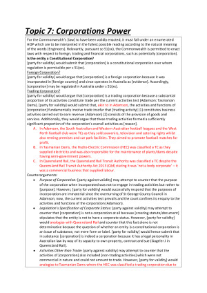 60 Pages of Exam Template Notes Inclusive of Case Summaries for Extra Understanding. I used these and obtained a 78 overall but a HD in exam - stuffed up in assignment lol. My approach to exams is I want my notes to be as comprehensive as possible so that all I need to do is insert names into the template. I can say with a high degree of certainty that these notes will get you a HD in the exam. Topics include all examinable content (excluding the irrelevant bits they teach): 3. Manner and Form 4. Executive Powers of the Commonwealth 5. Commonwealth Legislative Power 6. External Affairs 7. The Corporations Power 8. Spending Power 9. Implied Intergovernmental Immunities 10. The Seperation of Powers 11. Implied Political Freedoms 13. Inconsistency - Section 109