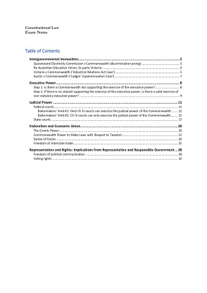 These notes cover the entire Constitutional Law course, and integrate all the relevant cases and secondary reading materials. These exam notes achieved a 91 subject score.