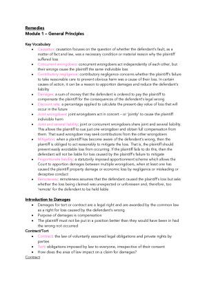 - General Principles - Damages at statute & common law - Aggravated & Exemplary Damages - Personal Injury under the CLA - Collateral Benefits, Assessing Possibilities, Interest and Taxes - Property Damages - Trespass to Land, Economic Torts, Breach of Contract - Specific Performance/Injunctions, Rescission, Rectification - Australian Consumer Law s 236 - Restitution