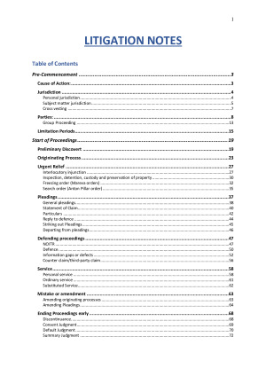 Pre-Commencement 3 Cause of Action 3 Jurisdiction 4 Personal jurisdiction 4 Subject matter jurisdiction 5 Cross vesting 7 Parties 8 Group Proceeding 13 Limitation Periods 15 Start of Proceedings 19 Preliminary Discovert 19 Origininating Process 23 Urgent Relief 27 Interlocutory injunction 27 Inspection, detention, custody and preservation of property 30 Freezing order (Mareva orders) 32 Search order (Anton Pillar order) 35 Pleadings 37 General pleadings 38 Statement of Claim 40 Particulars 42 Reply to defence 44 Striking out Pleadings 45 Departing from pleadings 46 Defending proceedings 47 NOITR 47 Defence 50 Information gaps or defects 52 Counter claim/third-party claim 56 Service 58 Personal service 58 Ordinary service 61 Substituted Service 62 Mistake or amendment 63 Amending originating processes 63 Amending Pleadings 64 Ending Proceedings early 68 Discontinuance 68 Consent Judgment 69 Default Judgment 70 Summary Judgment 72 Settlement 74 Calderbank offer 74 Offer of compromise 75 Judgment 81 Appeal 83 Interlocutory order 83 Final judgment 85