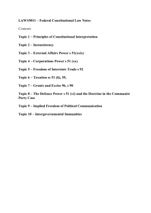 Comprehensive Fed Con scaffolds used to learn the course. Scored a HD using these detailed, easy to follow scaffolds. Topics covered: Topic A: Principles of Constitutional Law/ Trade & Commerce Power Topic B: Inconsistency Topic C: External Affairs Power Topic D: Corporations Power Topic E: Freedom of Interstate Trade Topic F: Taxation and Grants Topic G: Defence Power Topic H: Implied Freedom of Political Communication Topic I: Intergovernmental Immunities