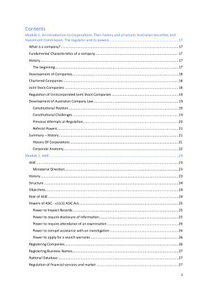 Contents Module 1: An introduction to Corporations: Their history and structure; Australian Securities and Investment Commission: The regulator and its powers Module 2: Partnership Law Module 3: Registration(Incorporation) And Its Effect Module 4: Constitutions and Internal Management Module 5 - Transacting by Companies and Companies’ Relationship with Third Parties Module 6 to 8 – Directors Duties Module 9 – Minority or Member’s Remedies Module 10 - Capital: The Nature Of Share Capital And Loan Capital Module 11 – Corporate Insolvency