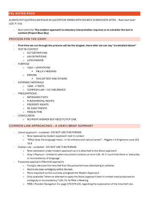 These notes give you a comprehensive rundown of the processes, authorities, and what to look out for when it comes to statutory interpretation in Australia. Topics Included: - Process overview - Old common law approaches - text in context - modern purpose approach - extrinsic materials - presumptions - relevant AIA sections with exact wording.