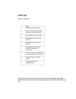 Comprehensive Business Marketing notes. Includes key theory and illustrations to facilitate learning and assist with major assessments. Everything needed to enable you to achieve the grade you want. Good luck! Topics: 1. Market planning and analysis 2. Business-to-business marketing & organisational buying behaviour 3. Inter-organisational relationships 4. Managing products for business markets 5. Managing services for business markets 6. Managing business marketing channels & supply chain management 7. Business marketing communications: personal selling & sales management 8. Pricing strategies for business markets 9. Marketing strategy and implementation