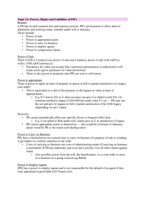 This set of detailed and structured notes are used to obtain a HD in the Succession Exam at the end of Semester 2 2024. Notes are written out in full (including introduction and conclusion), essentially acting as a template in the exam. These notes cover: - Intestate Succession - Will and Will Making - Mental Requirements for Will Making - Statutory Wills - Execution Requirements - Exceptions to Execution Requirements - Changing a Will - Interpretation of Wills - Gifts by Will - Family Provision - Personal Representatives - Grants of Representation - Case summaries - Functions and Duties of Personal Representatives - Powers, Rights and Liabilities of Personal Representatives