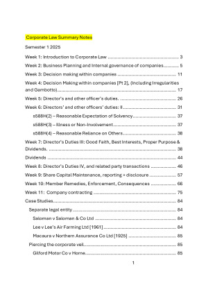 These notes contain everything you need for Corporate Law, right from the theoretical concepts, to relevant case law, as well as extracts from the Corporations Act. This is your ultimate reference for an exam or revision, as it also contains templates on how to answer questions on certain topics!!