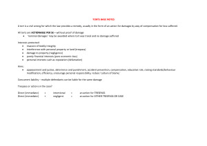 Comprehensive torts notes used to learn the content and study for the received a HD (85) with these notes. - Introduction and Historical Background - Trespass to Goods - Trespass to Land - Trespass to Person - Action on the Case for Wilful Injury - Psychiatric Injury to Relatives of Victims of Intentional Wrongs - Defences to Intentional Torts - Actions on the Case including Wilkinson v Downton - Negligence: Duty of Care - Negligence: Breach of Duty - Negligence: Causation and Remoteness of Damage and Scope of Liability - Negligence: Defences - Vicarious liability - Non-delegable duties - Concurrent, Joint and/or Several Liability for Personal Injury; Contribution Rights - Compensation for Personal Injuries - Compensation to third parties