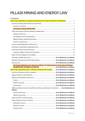 Using these notes I achieved a High Distinction in both the final exam and the overall unit. These comprehensive and easy-to-follow notes have been compiled using: - The prescribed textbook - Lecture slides and recordings - Case law and statutory provisions - Seminar revision questions and model answers Key Features: - Organised by topic - Colour-coded formatting for quick reference and easy reading - Designed to be fully self-sufficient: should be able to rely solely on these notes for completition of the unit Topics Covered: 1: Ownership of Energy Resources in a Public Resource Framework 2: Resource Titles - Permits, Licences, and Leases 3: Offshore Mining and Regulation 4: Climate Change Law 5: Environmental Regulation 6: Unconvential Gase 7: Renewable Energy 8: Carbon Capture 9: Royalities and Revenue 10: NEM and the Energy Market