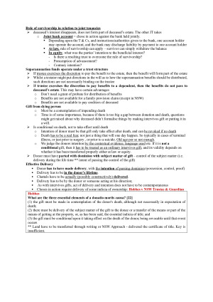 Succession Law Exam Notes – Comprehensive & Exam-Focused (14 Topics) Topic 3 Wills and Will Making Topic 4 Execution requirements Topic 5 Exceptions to Formal execution requirements Topic 6 CHANGING A WILL Topic 7 Interpretation of wills Topic 8 Gifts by Will Topic 9 intestacy Topic 10: Family Provision Topic 11 PERSONAL REPRESENTATIVES Topic 12 GRANTS OF REPRESENTATION Topic 13 The Personal rep’s duties and functions Topic 14 Powers, Rights and Liabilities of PR’s Notes cover all 14 topics in Succession Law in a very clear structure and all you need for EXAM Perfect for quick revision and issue-spotting, these notes prioritise clarity and relevance, helping you stay focused on what really matters for the exam.