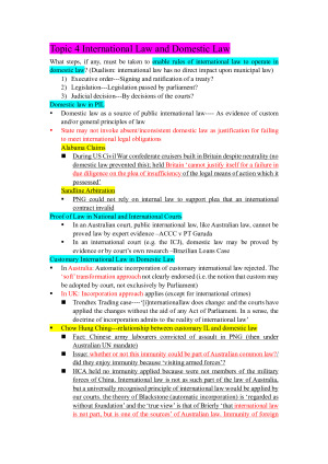Well-structured notes cover topics for both midsemester and final exams. Topics covered: 2. Sources of Public International Law 3. The Law of Treaties 4. International Law and Municipal Law 5. Personality, Statehood, Self-Determination 6. Title to Territory 7. State Jurisdiction 8. Immunity from Jurisdiction I, Immunity from Jurisdiction II 10. State Responsibility I 11. State Responsibility II 12. Use of Force 13. Implementation, Enforcement, Accountability