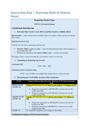 Ace both Calculations and Theory in BANK3011 with these step-by-step, exam-focused notes! These notes are designed to make your BANK3011 study efficient, clear, and effective. Included: * Step-by-step breakdowns for key concepts * Clear steps for tackling mathematical questions * Tips for approaching tutorial and exam-style questions * Covers everything you need to ace both calculation and theory parts of BANK3011 * Colour-coded sections separating calculation and theory for easy, efficient revision * Based on lecture materials, tutorial materials, lecturer comments and key tips These notes are perfect if you want to fully understand both the quantitative and conceptual sides of the unit to prepare confidently for exams. They were used to achieve a HD in the final exam. Topics covered: Topic 1: Introduction and Overview Topic 2: Interest Rate Risk Part 1 Topic 3: Interest Rate Risk Part 2 Topic 4: Market Risk Topic 5: Credit Risk Part 1 Topic 6: Credit Risk Part 2 Topic 7: Credit Risk Part 3 Topic 9: Sovereign Risk Topic 10: Liquidity Risk Topic 11: Deposit Insurance and Other Liability Guarantees Topic 12: Capital Adequacy Topic 13: FinTech Lending