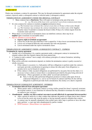 ALL EXAMINABLE TOPICS INCLUDED. Comprehensive notes that include detailed and easy to understand content and case summaries. This is all that I needed in the exam to confidently answer each question. TOPIC 1 – TERMINATION BY AGREEMENT TOPIC 2 – TERMINATION FOR BREACH TOPIC 3 – TERMINATON FOR REPUDIATION TOPIC 4 – TERMINATION FOR DELAY TOPIC 6 – CONSEQUENCES OF AFFIRMATION OR TERMINATION TOPIC 7 – RESTRICTIONS ON THE RIGHT TO TERMINATE TOPIC 8 – DAMAGES TOPIC 9 – LIQUIDATED DAMAGES AND PENALTIES TOPIC 10 – SPECIFIC PERFORMANCE AND INJUNCTIONS TOPIC 11 – ACTION FOR DEBT TOPIC 12 – RESTITUTION TOPIC 13 – FRUSTRATION TOPIC 14 – VITIATING FACTORS TOPIC 15 – RECISSION TOPIC 16 – MISLEADING AND DECEPTIVE CONDUCT TOPIC 17 – UNCONSCIONABLE CONDUCT UNDER STATUTE TOPIC 18 – REMEDIES UNDER STATUTE