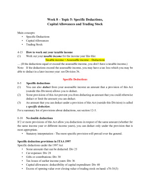 1. About These Notes These notes are designed as a clear and structured companion to the Income Tax Law course. They are not lecture slides or assignments, but instead provide concise explanations of key concepts, legislation references, and case summaries to make revision easier. 2. What’s Inside - Step‑by‑step breakdowns of important tax law topics. - Relevant ITAA 1936 & ITAA 1997 provisions explained in plain language - Key High Court and Federal Court case summaries with facts & decisions - Logical structure that follows weekly topics for this semester - Concise and exam‑ready, saving you hours of sifting through lectures and textbooks 3. Topics Covered - Week 8: Specific Deductions (deduction provisions, capital allowances, and trading stock) - Week 9: Deduction Limitations and Tax Accounting ("derived" and "incurred" concepts, and limitations on deductions) - Week 10: Tax Entities (individuals, companies, partnerships, trusts, and tax rates)