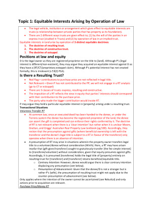 Topic 1: Co-Ownership Topic 2: Equitable Interests Arising by Operation of Law Topic 3: Mortgages Topic 4: An Introduction to the Enforceability of Property Interests, Systems of Title, the Torrens System and Conveyancing Topic 5: The Principle of Indefeasibility of Title Topic 6: Exceptions to Indefeasibility of Title Topic 7: Unregistered Interests Under the Torrens System
