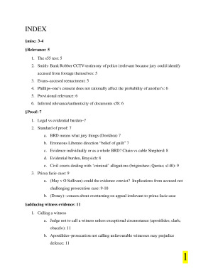These notes contain everything you need to do well in the midsem exam (subject to changes in exam content covered (NB These notes have a sister set of notes for the final exam. Together they cover the course comprehensively.)) The bold page numbering and index at the end are there to be used in the exam. You see a hearsay issue look at the index, find the page and then you're right there with comprehensive and detailed notes on that issue. (NB the numbering in the preview will be off due to formatting of the preview document, but the numbering is correct in the actual document)-- I recommend that you colour code the index, but it worked fine for me without. Topics covered: -Intro to evidence -Relevance -Proof I -Adducing witness evidence -Documents and real evidence -Credibility -Hearsay