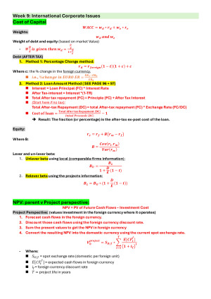 FULL FORMULA SHEET TO ACE YOUR FINAL EXAM Content Coverage: Week 1: Introduction to International finance & exchange rate Week 2: Description of FX markets & analysis of exchange rate risk Week 3: International parity conditions Week 4: Exchange rate systems and fundamentals Week 5: Exchange rate trading and forecasting Week 7: Foreign currency derivatives Week 8: FX risk hedging and Management within Multinationals Week 9: International corporate issues Week 10: International financing: Cross-listing and Eurobonds