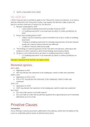 These notes collate and synthesise Administrative Law course content that could be tested on the exam essay question. The notes first cover the foundational concepts of Administrative Law, which will ground your exam essay response. Then, the notes are divided according to the below topics: - The Role of the Ombudsman - Merits Review vs Judicial Review - Administrative Law Reform - Freedom of Information - Human Rights - Delegated Legislation - Reasons - Jurisdictional Error - Materiality - Privative Clauses Under these topics, the notes bring together the lecture content, reading materials, relevant legislation and case summaries. They would be a helpful reference point for practice essays and exam preparation. ABOUT ME: I graduated from the JD with a H1 WAM and in the top 10 of my cohort. Using these notes, I achieved a score of 87 in Administrative Law.