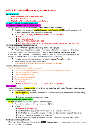These comprehensive HD study notes, created by a Dean’s List student, are designed as your all in one resource offering clear explanations, structured summaries, and exam-focused insights that make them perfect for open-book exams and efficient revision. Contents Week 1 covers an introduction to international finance and exchange rates. Week 2 focuses on the structure of foreign exchange markets and the analysis of exchange rate risk. Week 3 examines international parity conditions. Week 4 explores exchange rate systems and economic fundamentals. Week 5 looks at exchange rate trading and forecasting approaches. Week 7 introduces foreign currency derivatives. Week 8 discusses FX risk hedging and its management within multinational corporations. Week 9 considers international corporate finance issues. Week 10 concludes with global financing through cross-listings and Eurobonds.