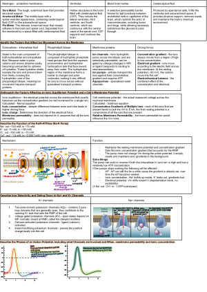 BMS1052 Notes – Weeks 1–3 (Neuroscience) These notes cover all key learning objectives from Weeks 1–3 of BMS1052 in clear, structured detail, making them perfect for MCQ revision and short-answer preparation. What’s Included Neurons: structure of prototypical neurons, soma/organelles, cytoskeleton, axons and dendrites, neuron classification. Glial Cells: oligodendrocytes, Schwann cells, astrocytes, microglia, and ependymal cells – roles and locations. Nervous System Organisation: CNS vs PNS, somatic vs autonomic (sympathetic and parasympathetic), spinal cord structure and function. Ion Movement & Membrane Potentials: concentration gradients, Nernst and Goldman equations, ionic equilibrium vs membrane potential, Na⁺/K⁺-ATPase pump. Action Potentials: channel selectivity and gating, phases of AP, refractory periods, stochastic nature of channel activity, conduction speed (myelin, axon diameter, node spacing, temperature). Synapses: structure and function of electrical vs chemical synapses, neurotransmitter release mechanisms, receptor types (ionotropic vs metabotropic), EPSPs vs IPSPs, neurotransmitter removal methods. Integration: factors determining EPSP size, spatial vs temporal summation (length constant λ, time constant τ), Cl⁻ mediated inhibition, modulation of vesicle release probability. Features Concise but detailed exam-ready explanations written in full sentences. Tables and diagrams included for quick comparison and visual learning. Colour-coded action potential graphs showing AP phases and refractory periods. Clear summary points for each learning objective to match assessment style.